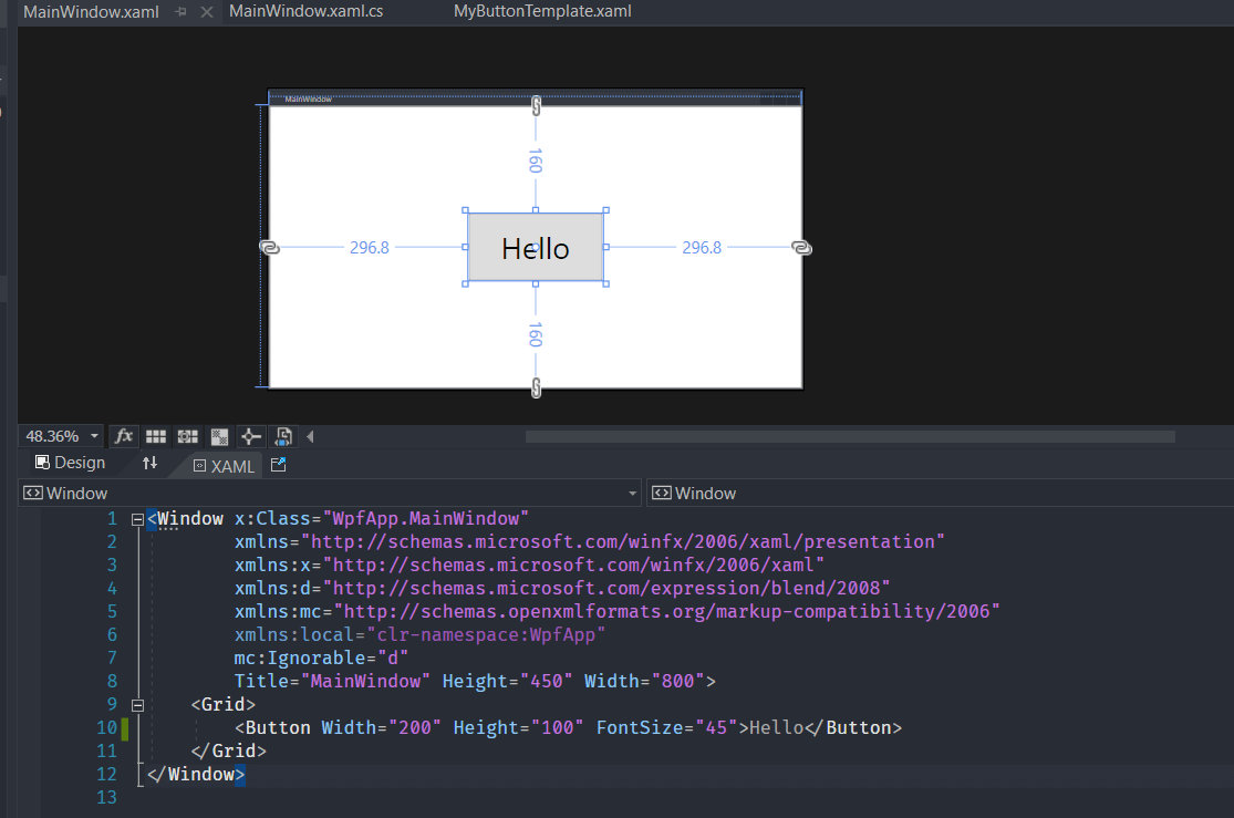 <Button Width="200" Height="100" FontSize="45" Template="{StaticResource ButtonTemplate}">Hello</Button>